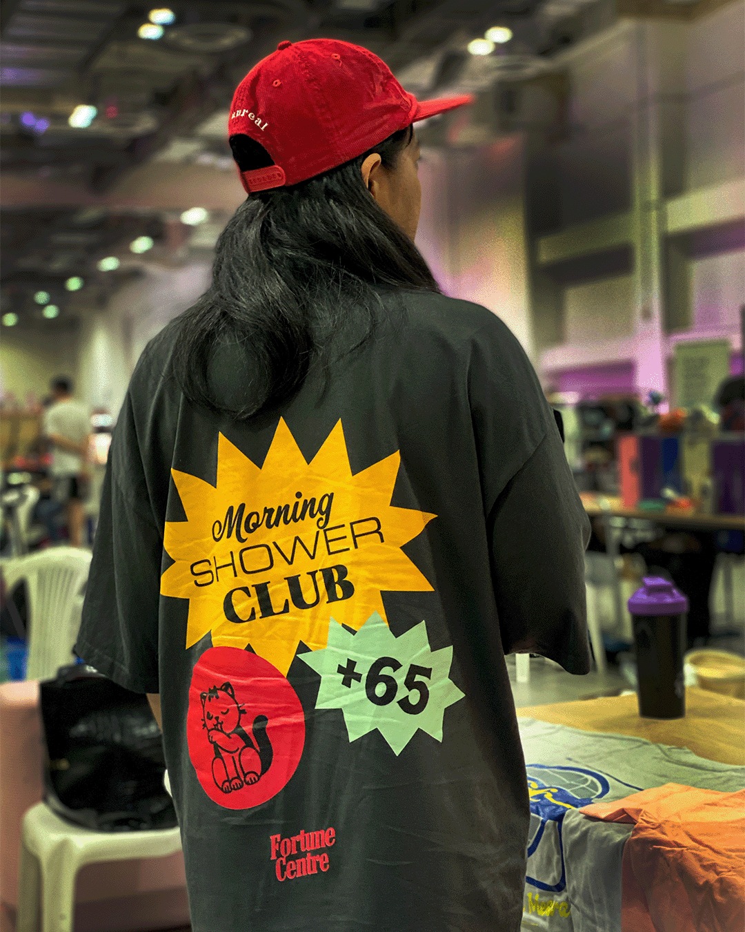 Loud graphic on the back. Subtle branding on the front. Cat mascot licking himself because… well, he’s cleaner than half the MRT at 8AM.